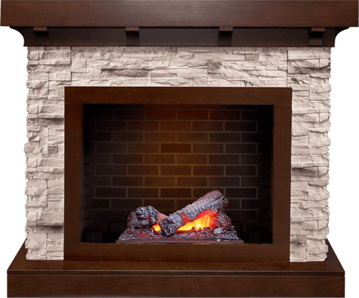 Портал выполнен из дерева и искусственного камня. Широкий постамент делает небольшую модель визуально более представительной. Фронтальная часть обрамления сделана без дополнительного декора в стиле кантри. Эта модель будет органично смотреться в классическом интерьере или в доме в стиле шале.