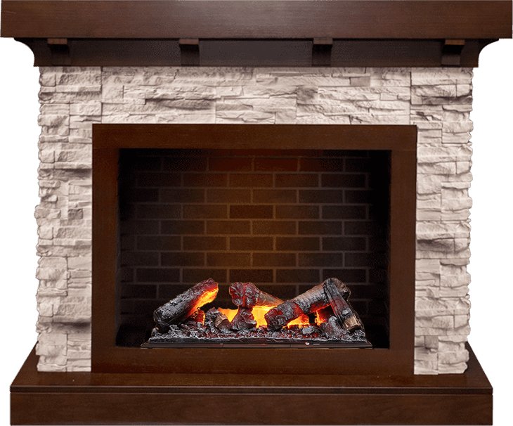 Портал выполнен из дерева и искусственного камня. Широкий постамент делает небольшую модель визуально более представительной. Фронтальная часть обрамления сделана без дополнительного декора в стиле кантри. Эта модель будет органично смотреться в классическом интерьере или в доме в стиле шале.