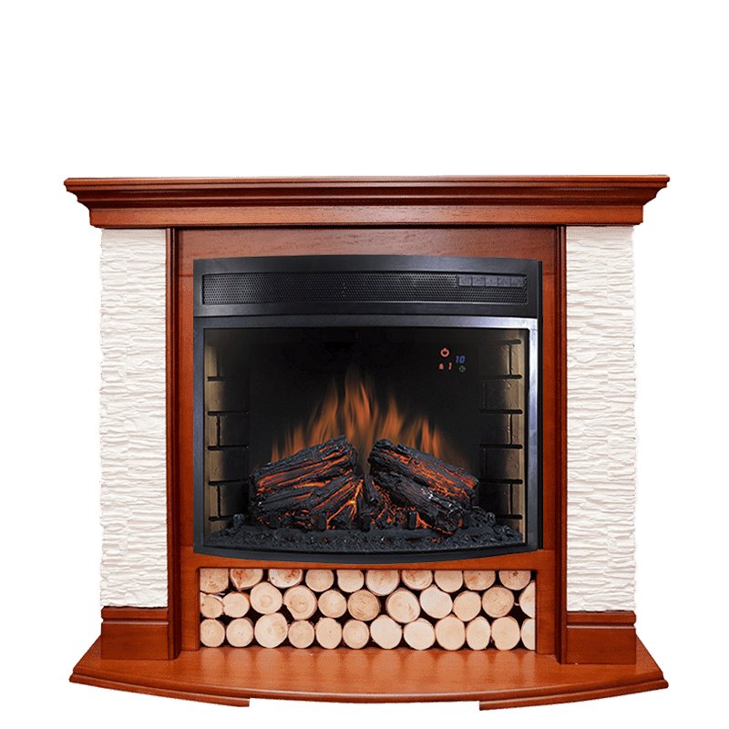 В нише под очагом расположена поленница с реальными спилами дров. Эта деталь является безусловным украшением модели, делая ее еще более стильной и оригинальной. Выдающийся вперед постамент имеет закругленную форму.