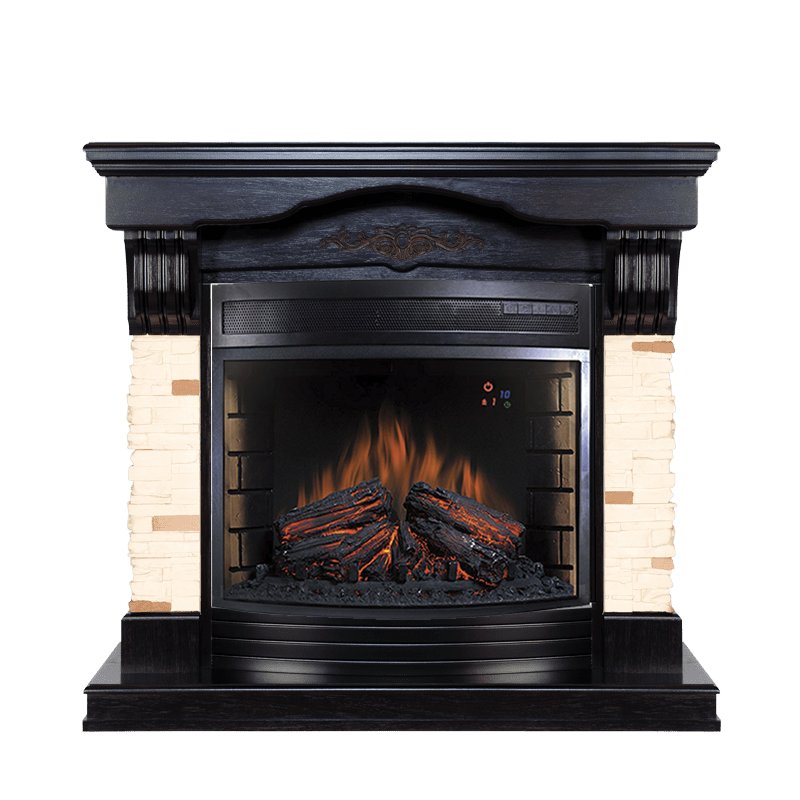 Портал Malta – классическая модель с изысканным арочным сводом над зоной очага и резными декоративными элементами в античном стиле. Деревянный постамент и столешница темных оттенков дерева эффектно контрастируют с боковыми колоннами из светлого камня.