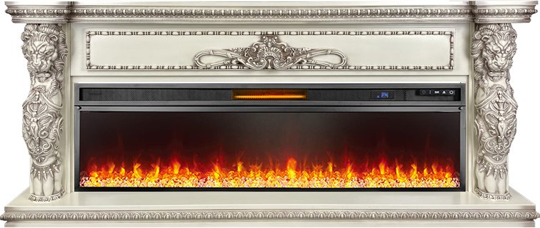 Портал Windsor – элегантная модель с богатым ярким декором, выполненная из высококачественных материалов. Колонны украшены образами необычных мифических существ с львиными головами, размещенными фронтально. Зона над очагом декорирована изысканным резным орнаментом.