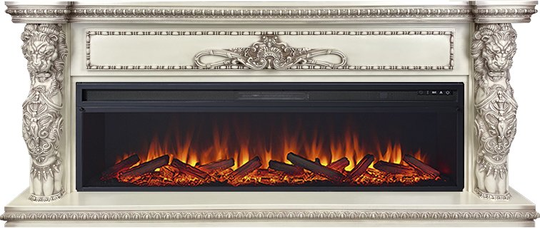 Портал Windsor – элегантная модель с богатым ярким декором, выполненная из высококачественных материалов. Колонны украшены образами необычных мифических существ с львиными головами, размещенными фронтально. Зона над очагом декорирована изысканным резным орнаментом.
