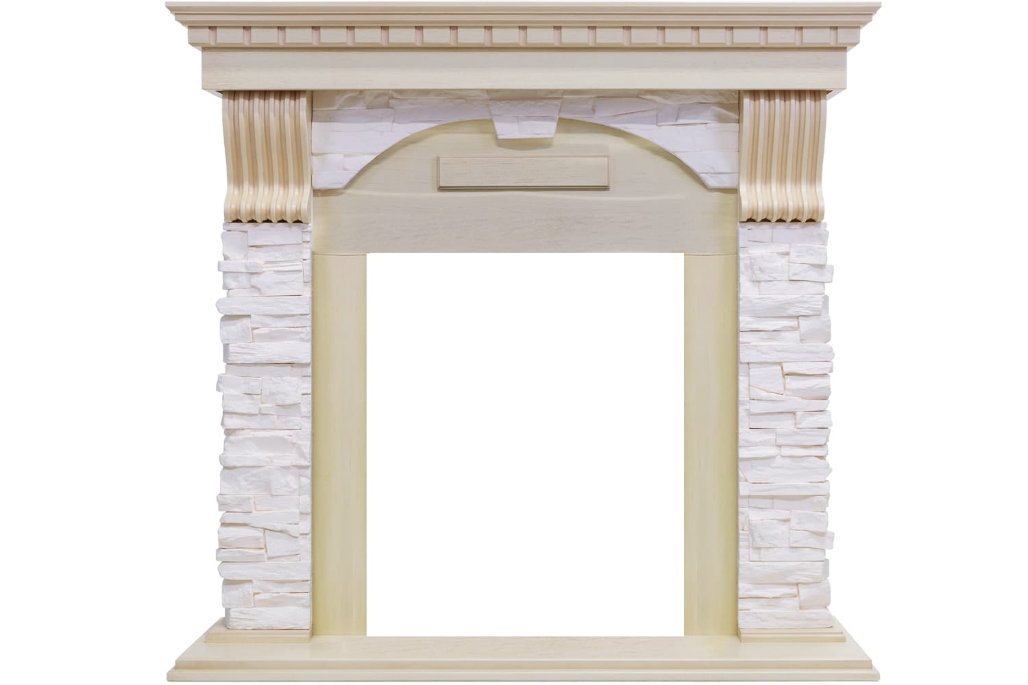 Портал Dublin выполнен в классическом стиле с античными элементами. Боковые колонны из светлого камня, стилизованного под натуральную сланцевую породу, дополнены резными узорами контрастного цвета. Столешница и постамент выполнены из дерева. Такое сочетание материалов подчеркивает изысканность портала и делает его выгодным приобретением для практических любых интерьеров.
