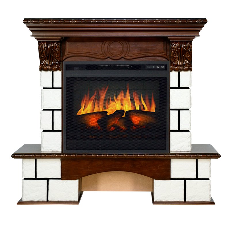 Модель представлена в нескольких вариантах, различающихся как по принципу установки (угловой или пристенный), так и цветовым решением облицовочного камня и деревянных элементов. Декорирована резными вставками в античном стиле.