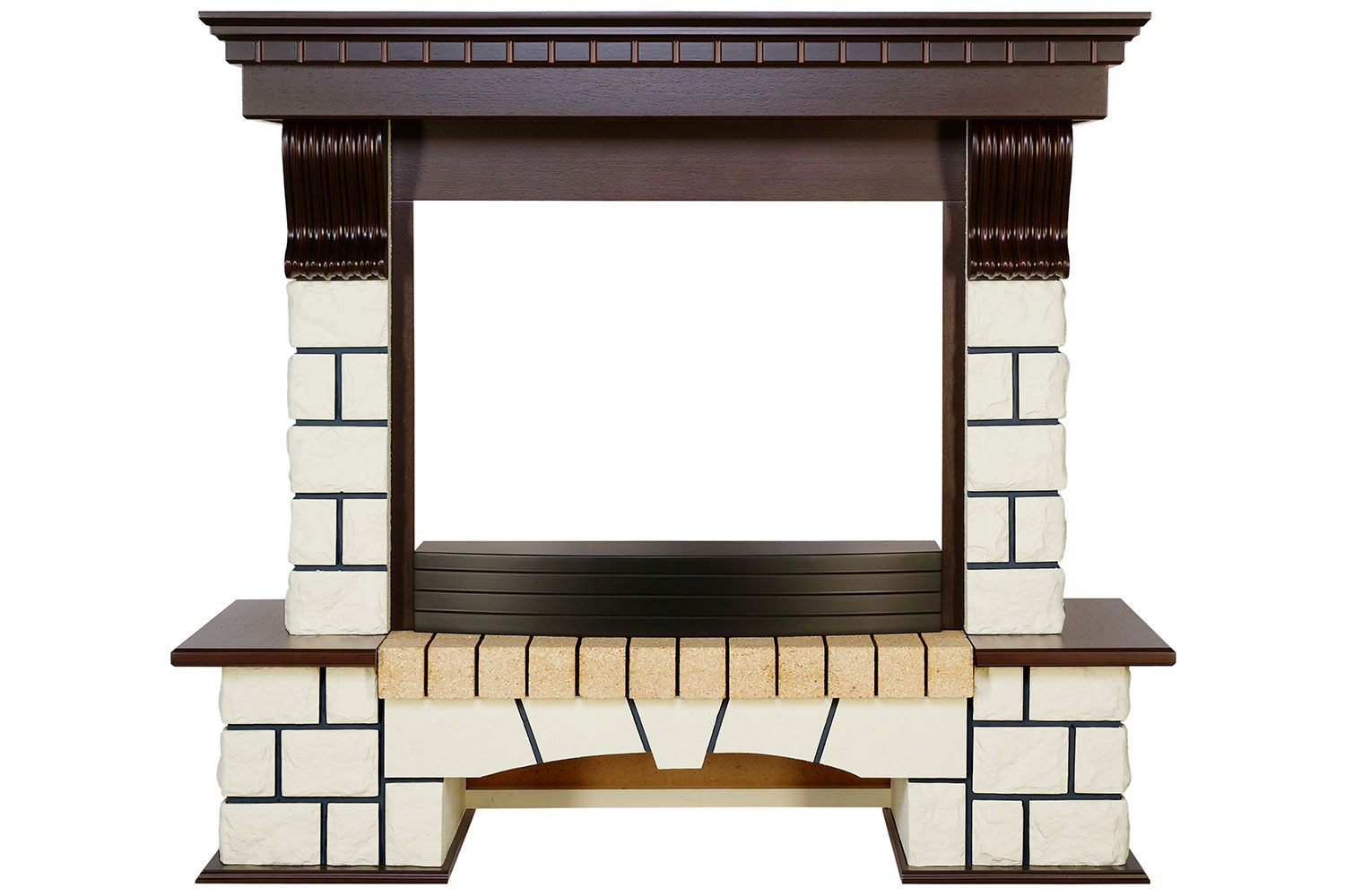 Модель представлена в нескольких вариантах, различающихся как по принципу установки (угловой или пристенный), так и цветовым решением облицовочного камня и деревянных элементов. Декорирована резными вставками в античном стиле.