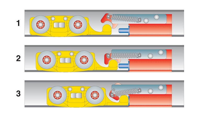 Комплект роликов для раздвижных дверей с максимальной нагрузкой 80 кг и гидравлической системой остановки (масляный доводчик).