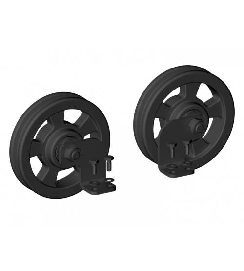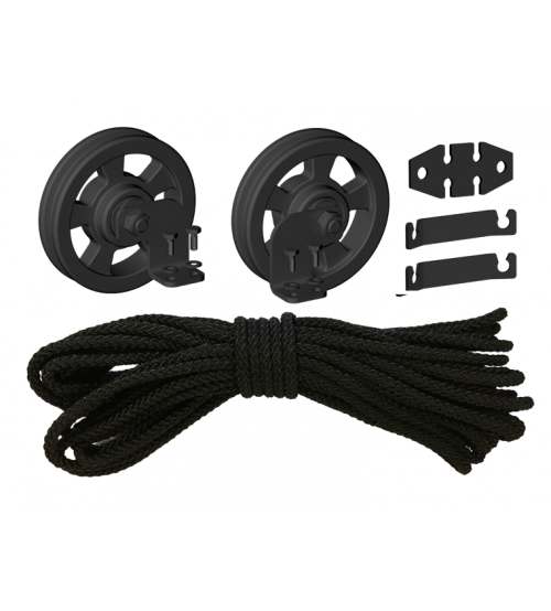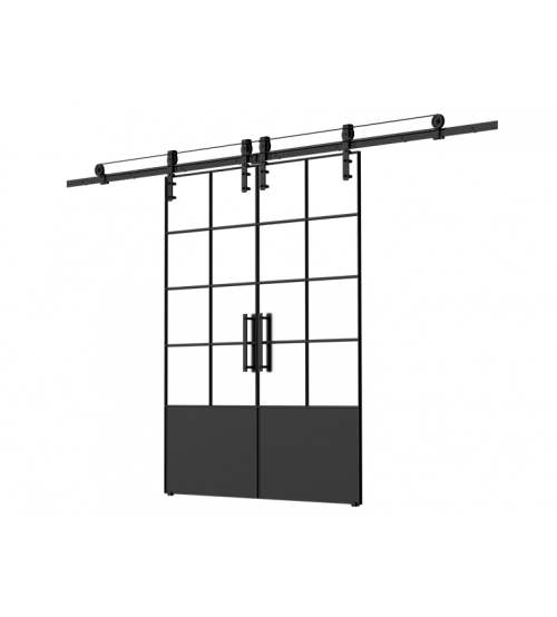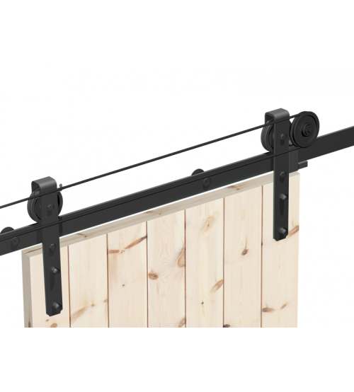 Механизм синхронного раздвижения двух дверей для амбарных механизмов серии ROC DESIGN. Двух створчатая дверь собирается из двух комплектов роликов и одного/ двух треков необходимой длины.