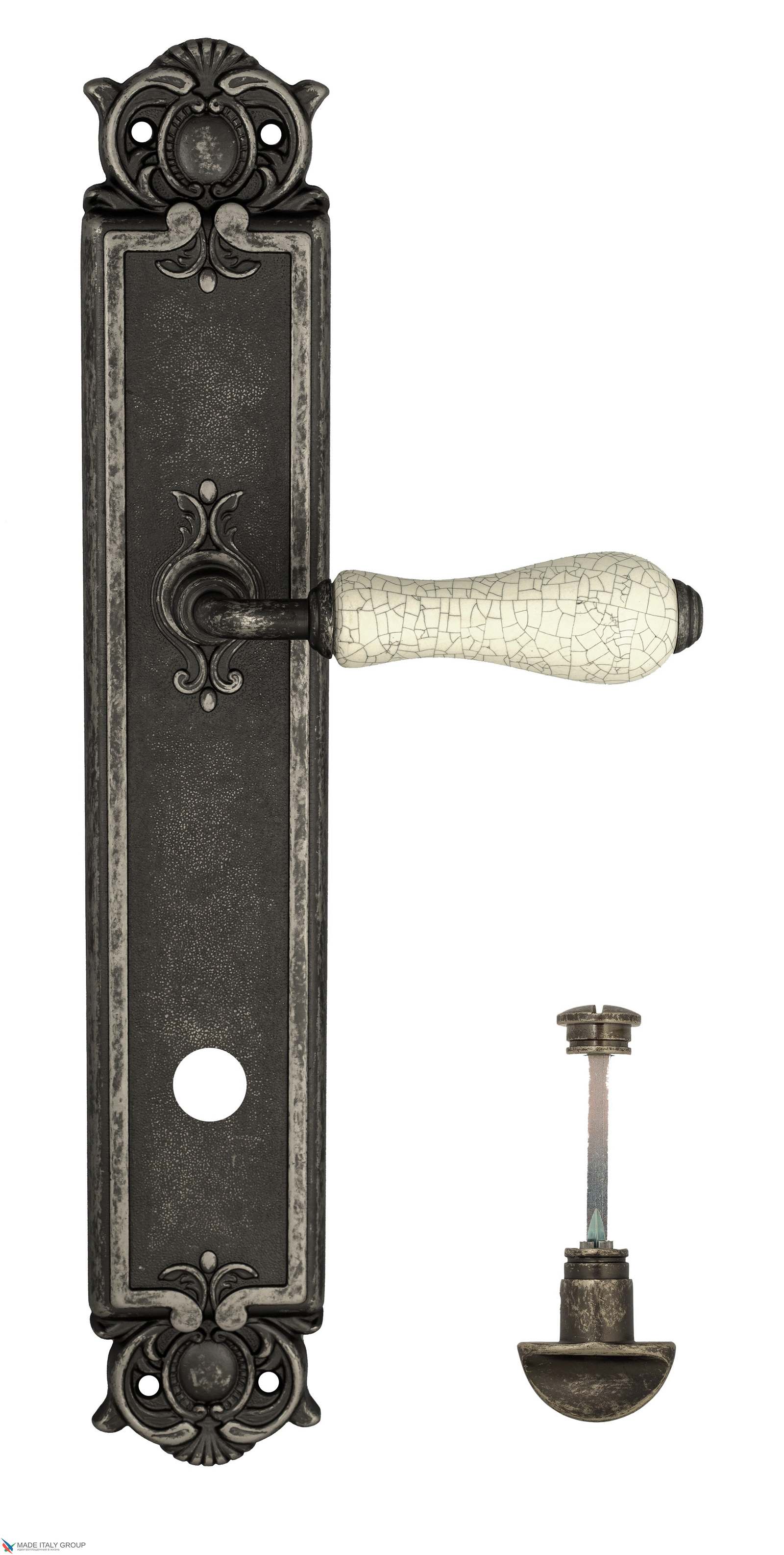 Дверная ручка Venezia COLOSSEO белая керамика паутинка WC-2 на планке PL97 античное серебро