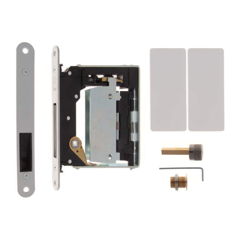 Bonaiti Комплект B NO-HA Mini 937 Замок WC магнитный для скрытых дверей с фиксатором POMOLO NO-HA CARTEL INOX и накладками NO-HA PLATE MDF 43.5X85.5X3 (2 шт), МАТОВЫЙ ХРОМ
